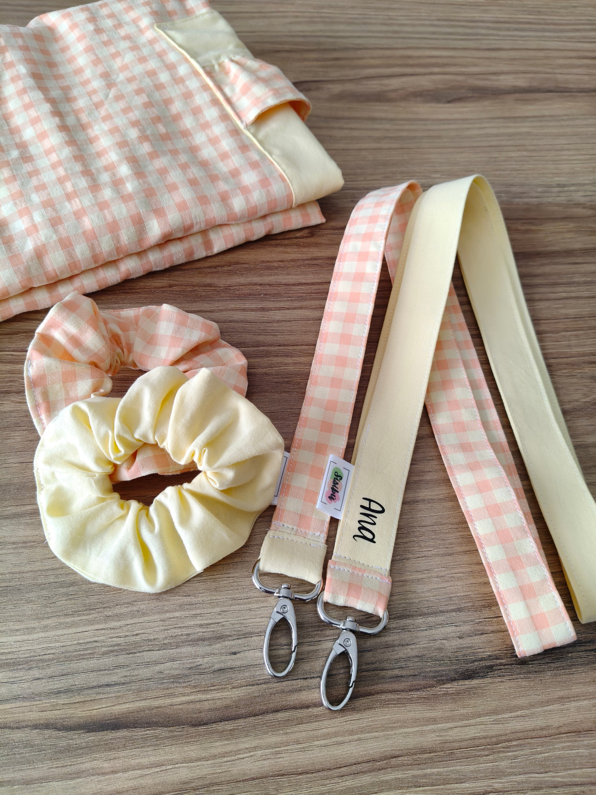 Lanyard o cuelgallaves en estampado de vichy vainilla o amarillo liso con mosquetón.