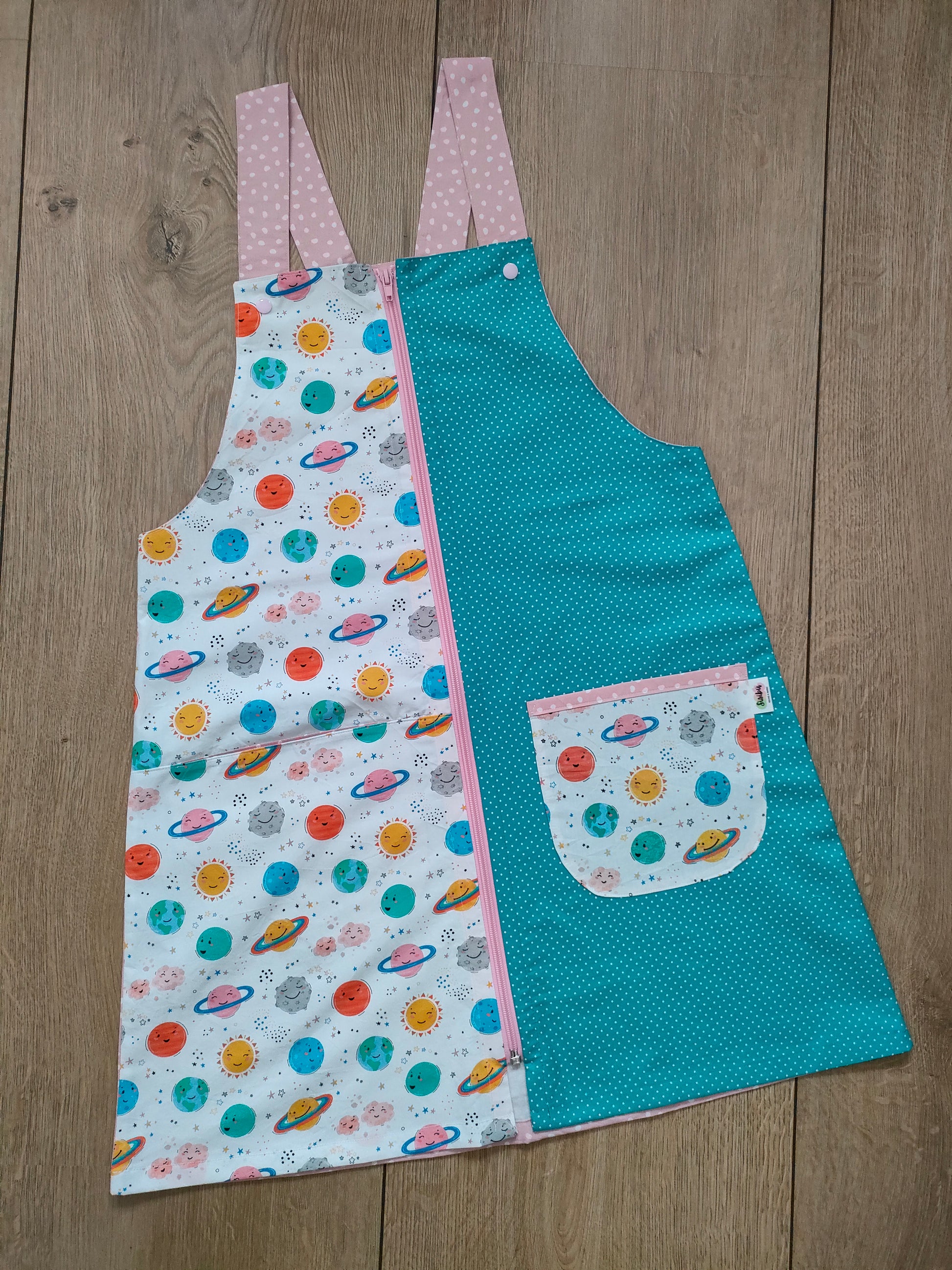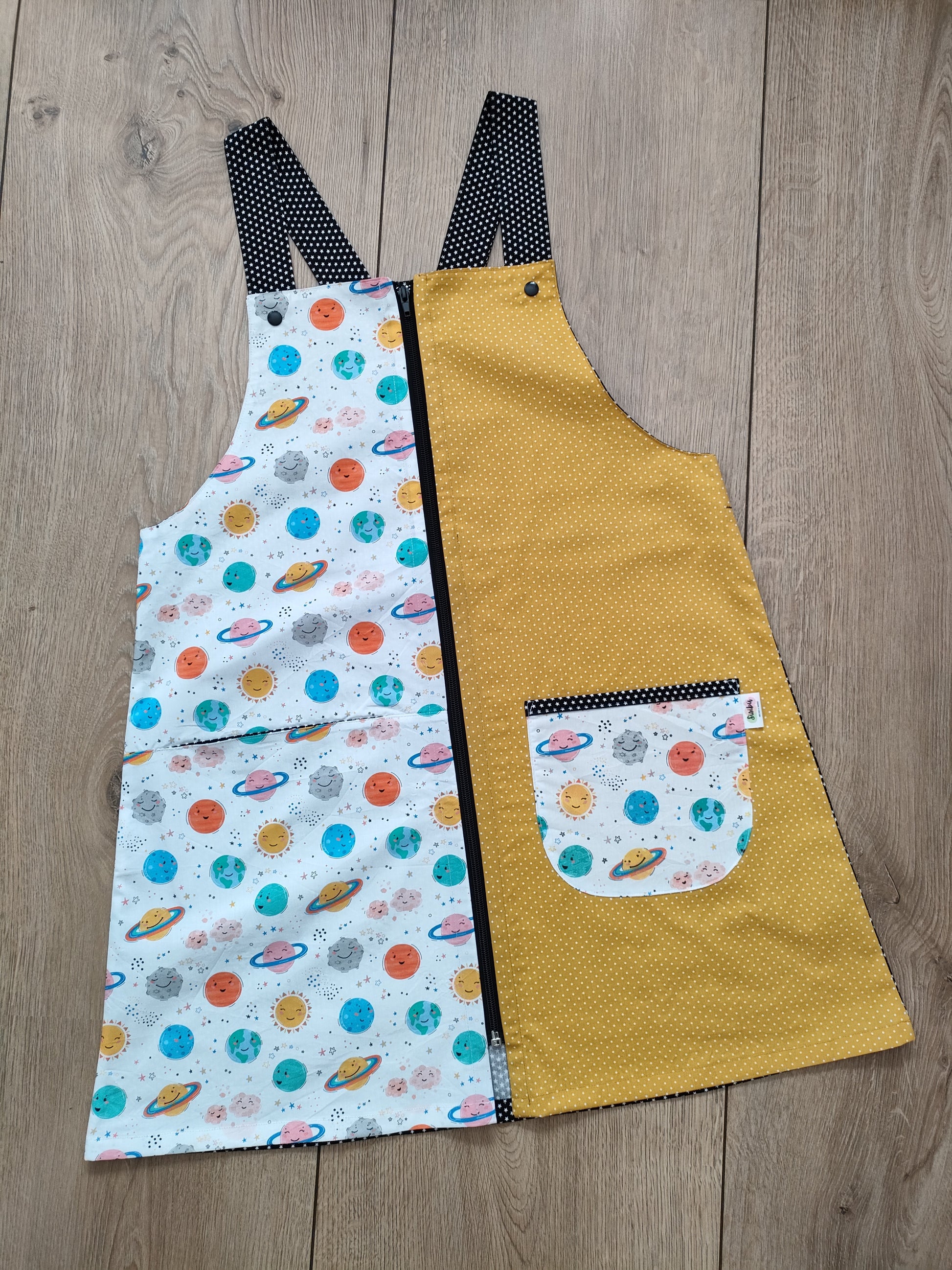 Estampado: Lateral planetas, lateral mostaza con topos blancos y espalda negra con estrellas mini o lateral azul turquesa con topos blancos y espalda rosa con topos blancos grandes.