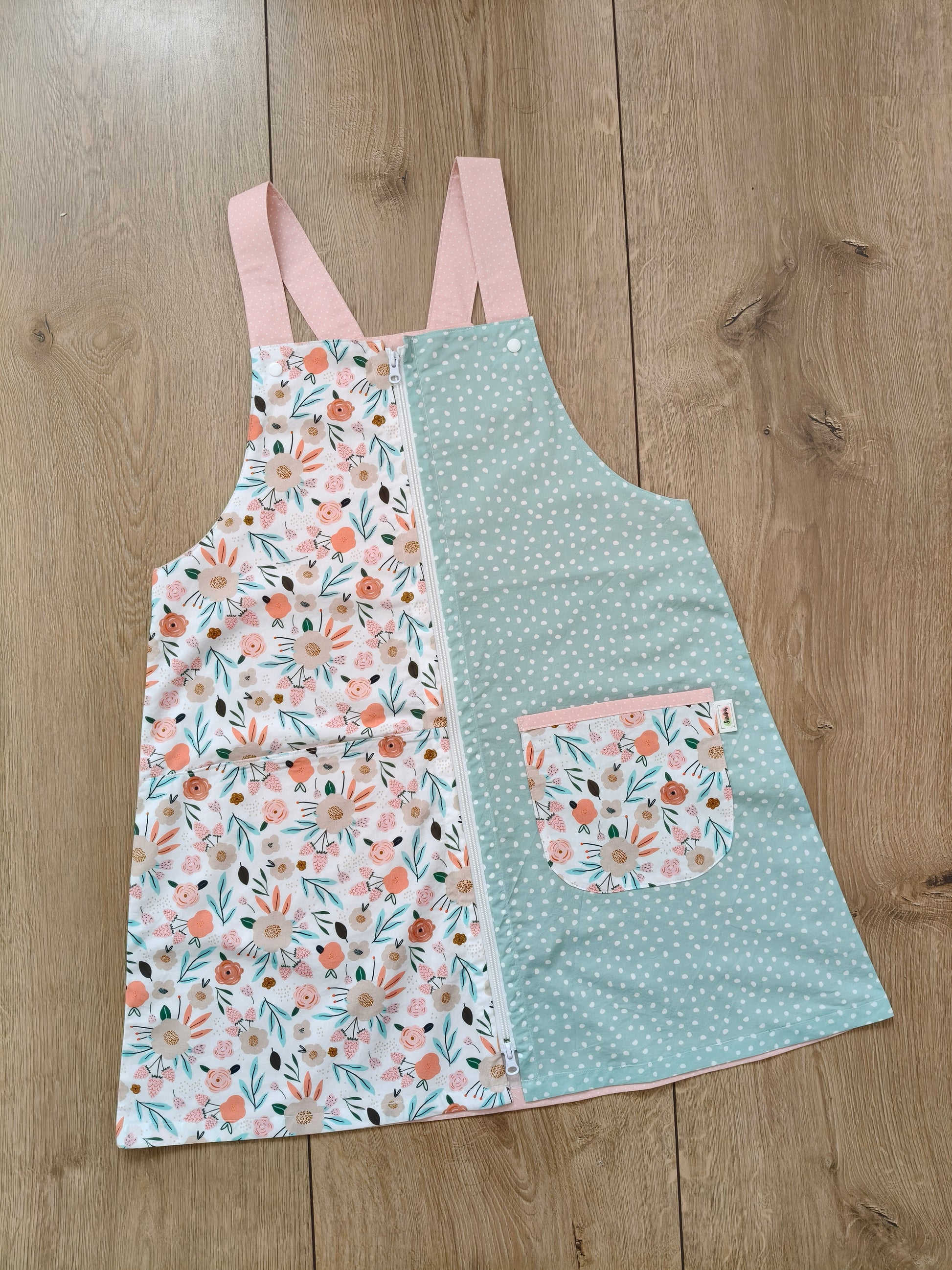 Estampado: Lateral flores primavera, lateral verde menta con topos blancos grandes y espalda rosa con topos blancos grandes.